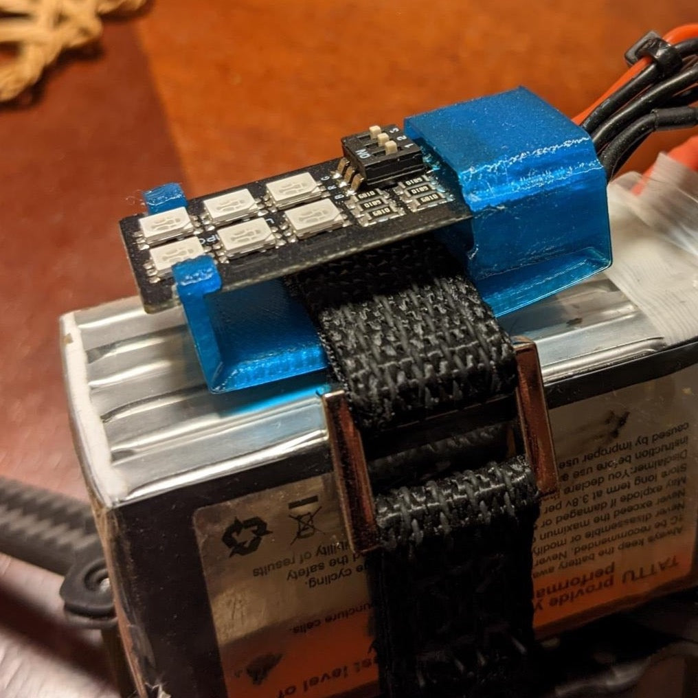 Lipo balance connector LED. Using a TPU Strap Mount can add LEDs and secure your balance lead to strap. Selector solder bridges or solder on the included switch to allow easy changes.