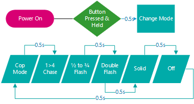 Cop Mode, Chase mode, Left -Right Flash (Shown in video), Double Flash. Solid On, Off.