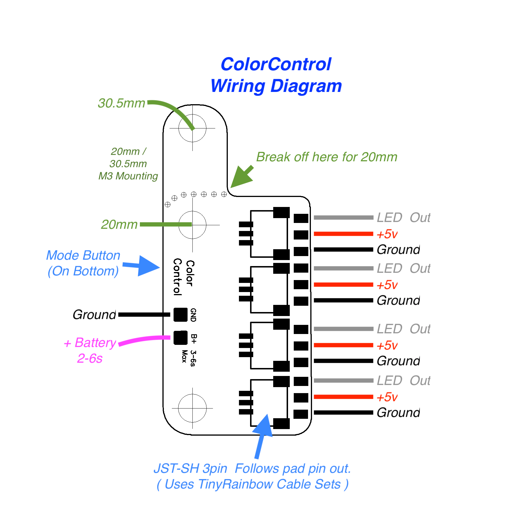 It has 4x JST-SH 3 pin outputs for direct use of TinyRainbow or Femto series leds. Soldering pads for direct wiring. (Connectors can be desoldered/ removed for super slim install)