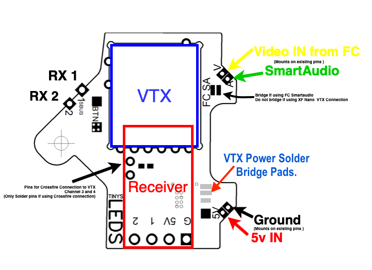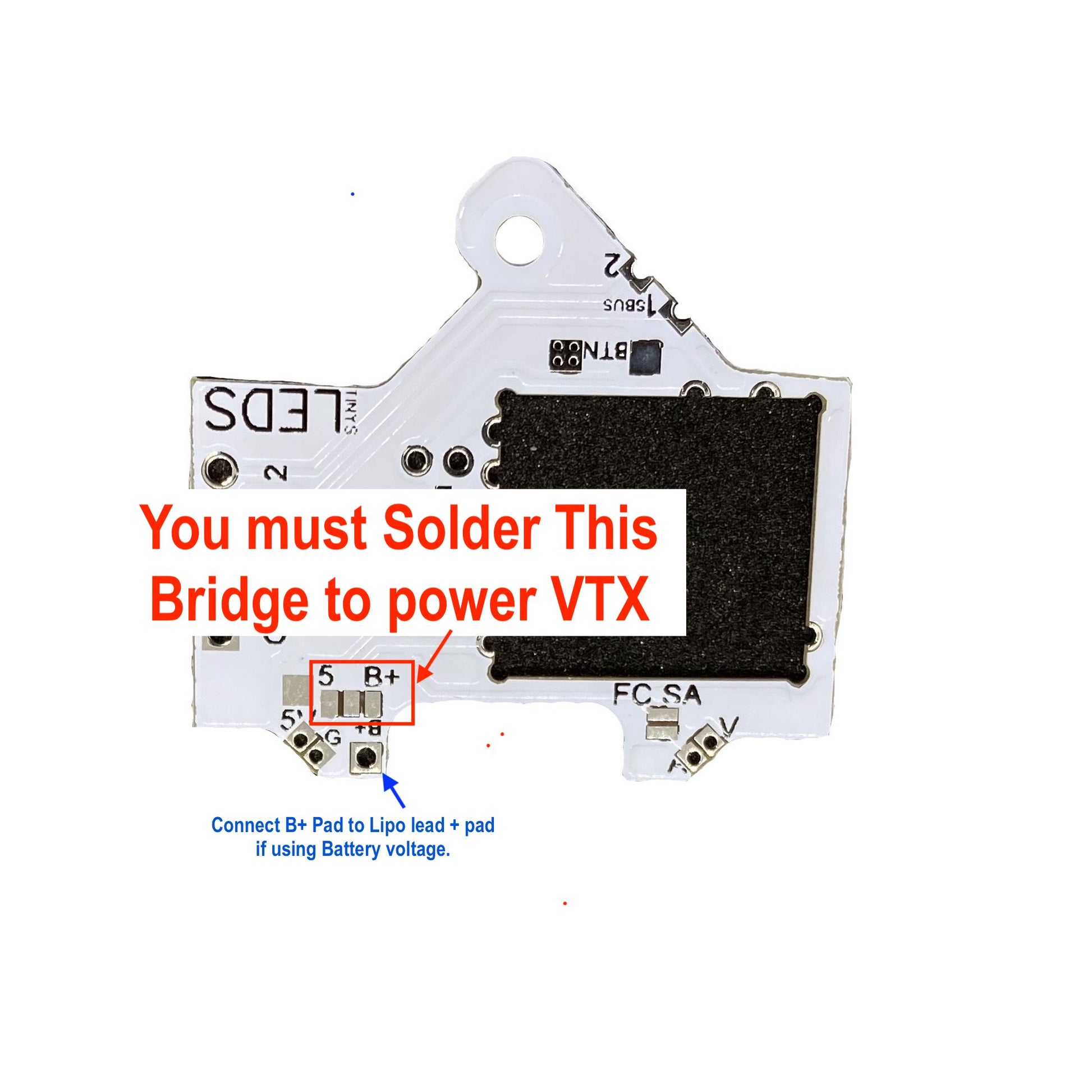 New Boards now have a Solder bridge to select 5v or Battery Voltage on top. You must bridge one for power to vtx. If you bridge B+ connect the B+ to the Battery input + pad on main board. Bridge only one connection to center pad to power vtx. Refer to your VTX manual for approved operating voltage.