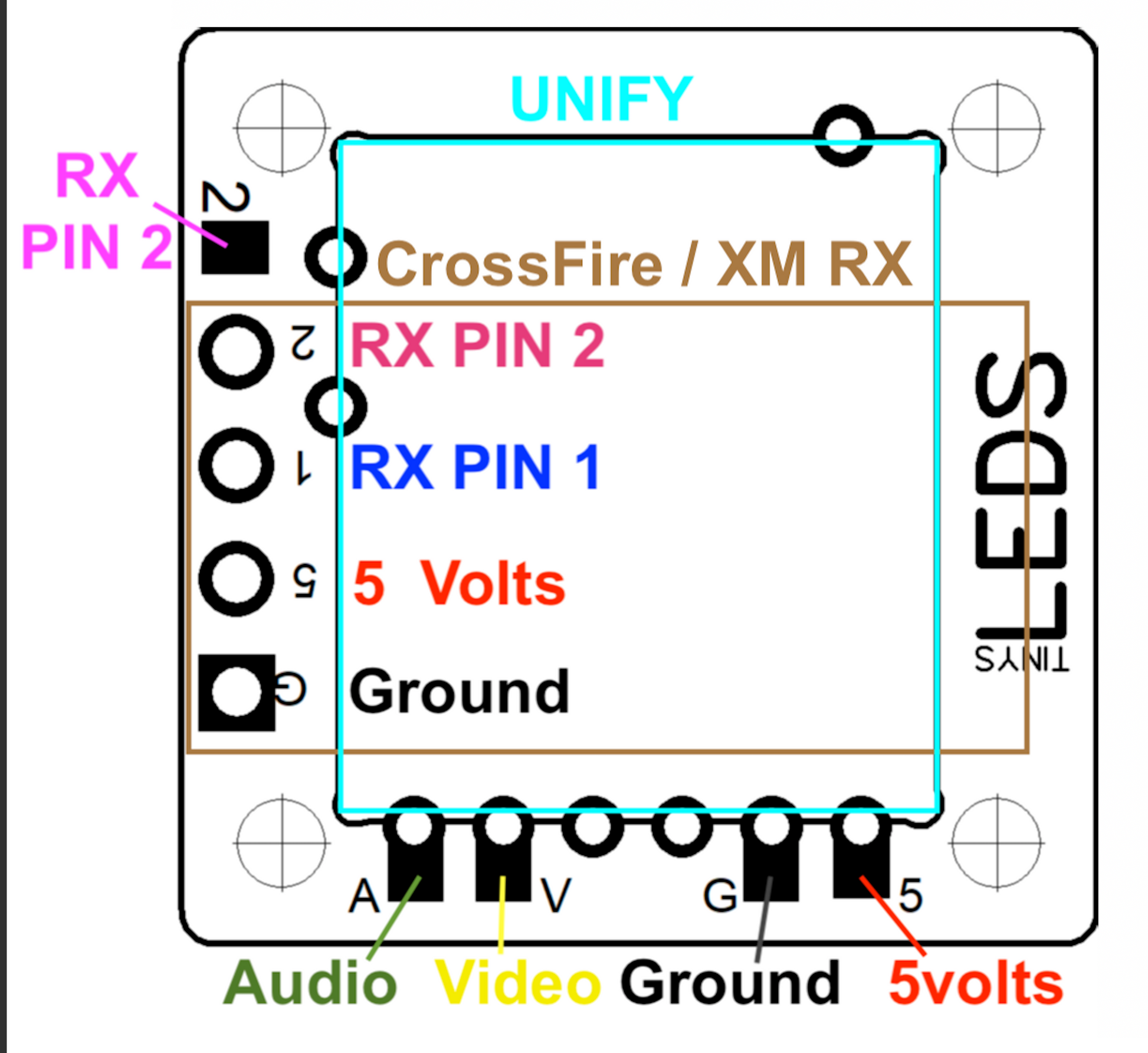 Receiver compatibility: This fits any RX that has a pin spacing of 2.54mm. All TBS and ImmersionRC Ghost RXs are 2.54mm as well as most Frsky RXs. Express LRS Receiver ELRS receiver have some smaller receivers that will match up if you solder to the pads with pins. If you need pins for an ELRS rx please leave a note on your order or email back from your order confirmation. If nothing else small wires will work to clean up the traces to your RX.