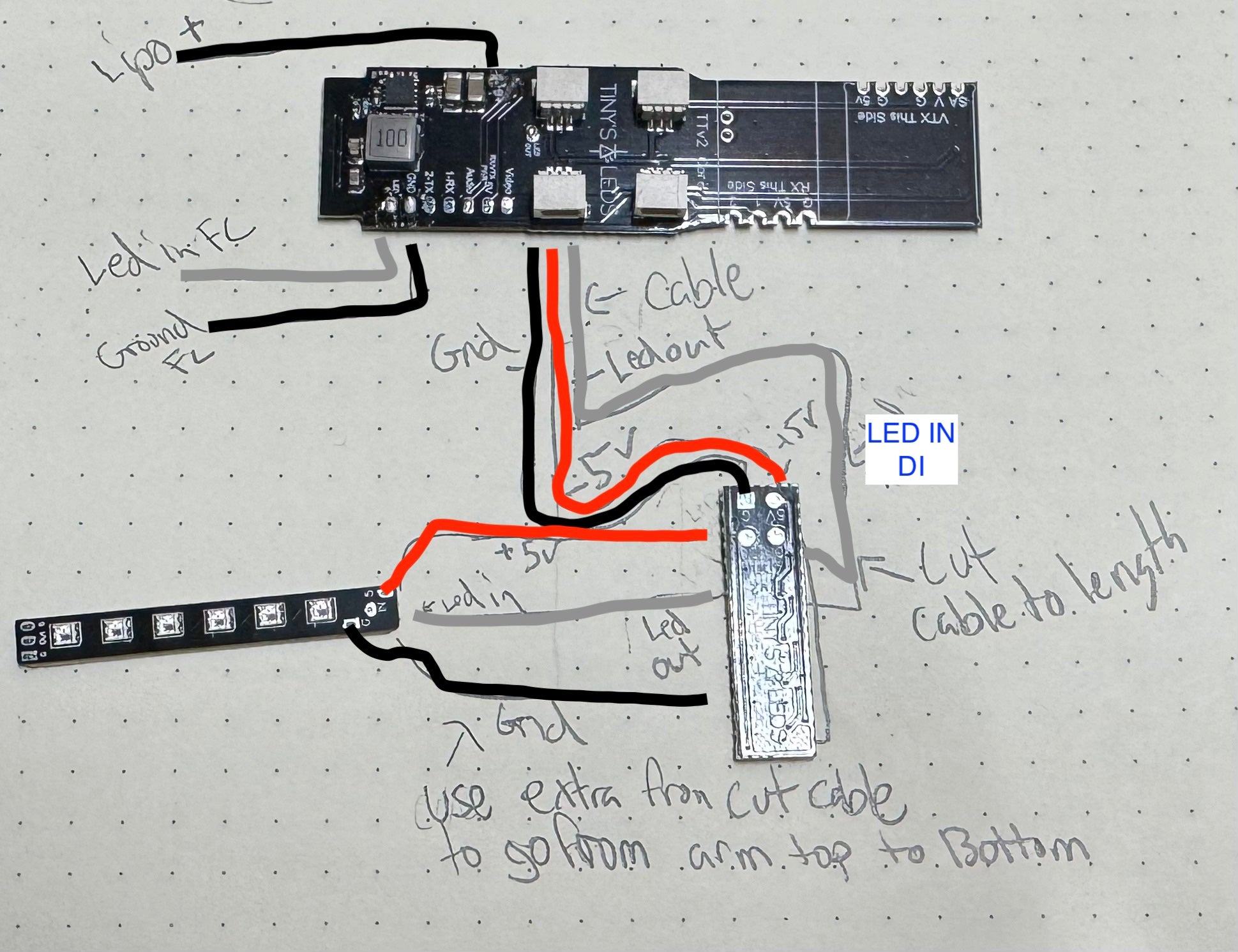 Notes. The LEDs for the arms are a tight fit and are mean to press fit in to the plastic notched area. They will not rest on your motor wires. If they do not fit you may need to shave off the edge of the PCB with a file or razor blade.